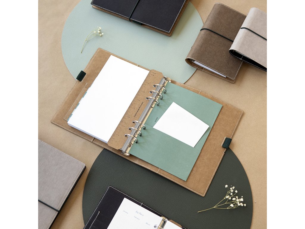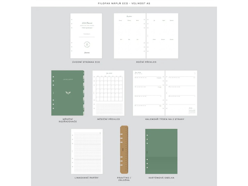 - Papírová krycí stránka, přední strana, nedatovaný roční plánovač, kalendář CZ&SK, tečkované papíry, linkované papíry, seznam úkolů, kontakty, pravítko / záložka, kartonová obálka.