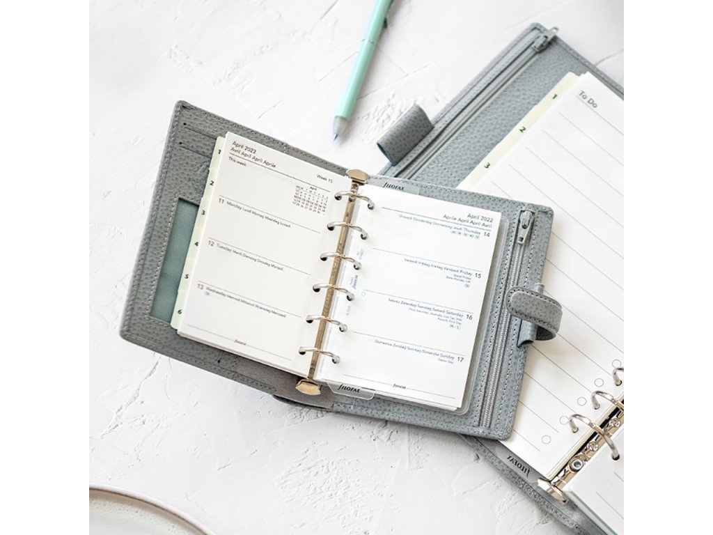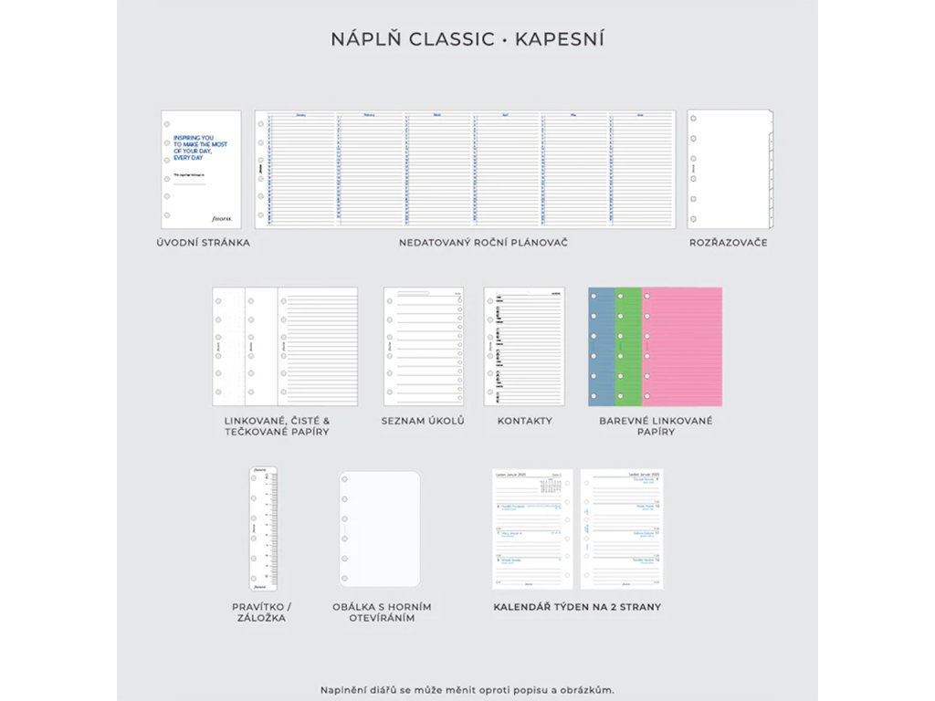 - Papírová krycí stránka, přední strana, nedatovaný roční plánovač, kalendář CZ&SK, 6 rozdělovačů, tečkované papíry, čisté papíry, linkované papíry, seznam úkolů, kontakty, modré linkované papíry, zelené linkované papíry, růžové linkované papíry, pravítko / záložka, obálka s horním otevíráním. Standardní naplnění je dodáváno zdarma a může se lišit od popisu nebo obrázku.