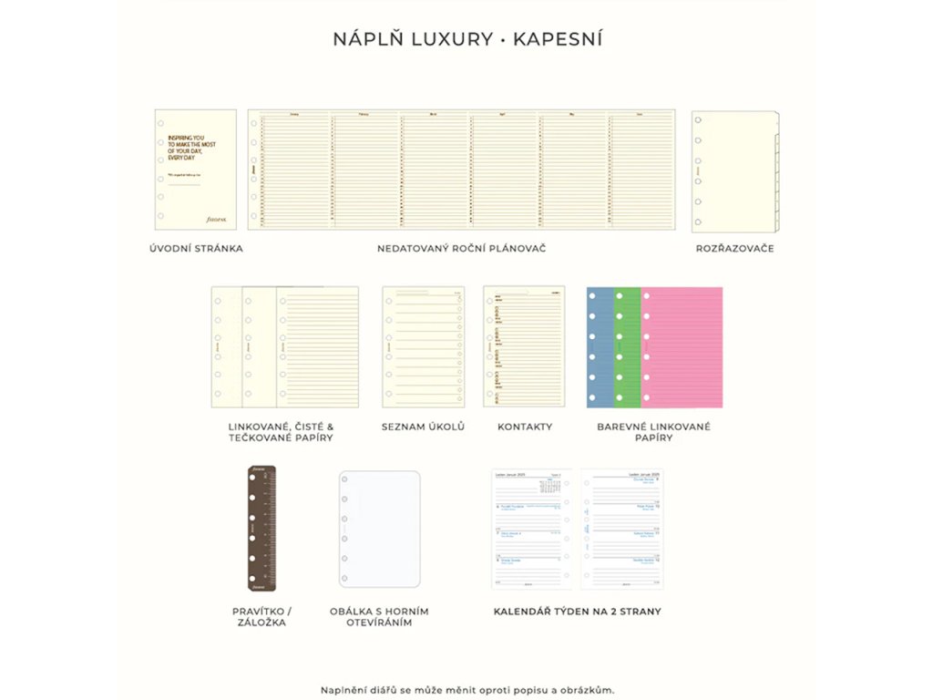 • Papírová krycí stránka, přední strana, nedatovaný roční plánovač, kalendář CZ&SK, 6 rozdělovačů, tečkované papíry, čisté papíry, linkované papíry, seznam úkolů, kontakty, modré linkované papíry, zelené linkované papíry, růžové linkované papíry, pravítko / záložka, obálka s horním otevíráním. Standardní naplnění je dodáváno zdarma a může se lišit od popisu nebo obrázku.