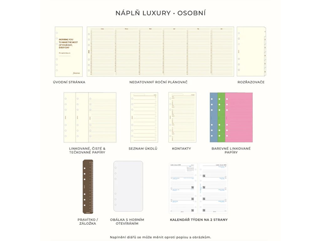 - Papírová krycí stránka, přední strana, nedatovaný roční plánovač, kalendář CZ&SK, 6 rozdělovačů, tečkované papíry, čisté papíry, linkované papíry, seznam úkolů, kontakty, modré linkované papíry, zelené linkované papíry, růžové linkované papíry, pravítko / záložka, obálka s horním otevíráním. Standardní naplnění je dodáváno zdarma a může se lišit od popisu nebo obrázku.