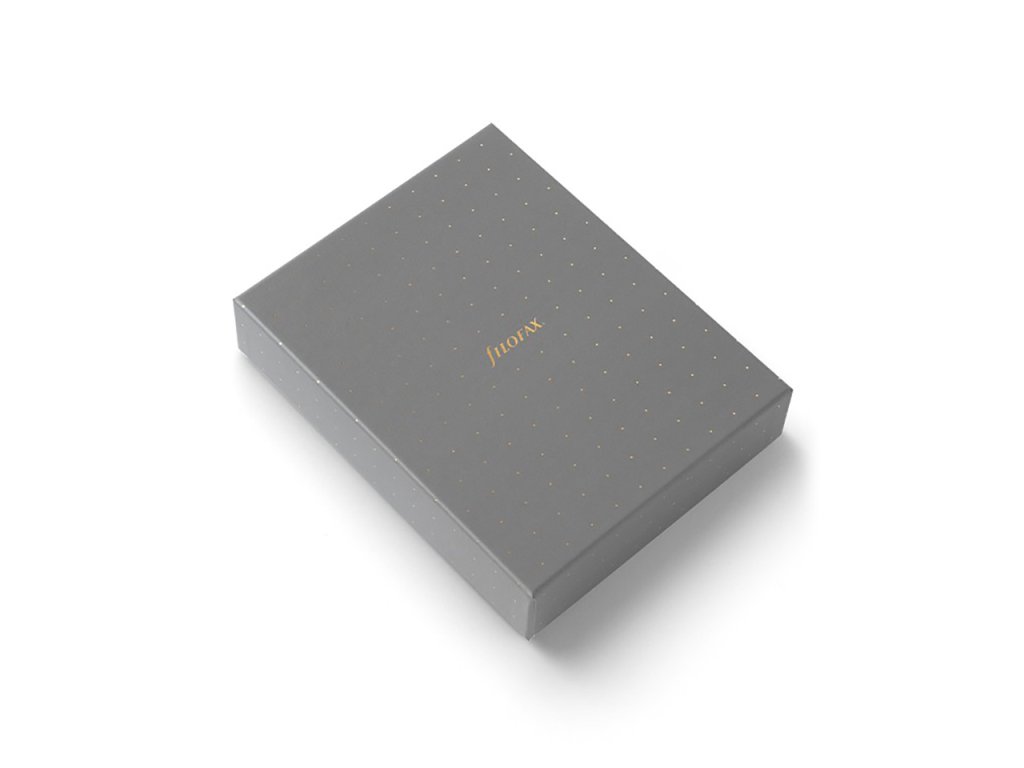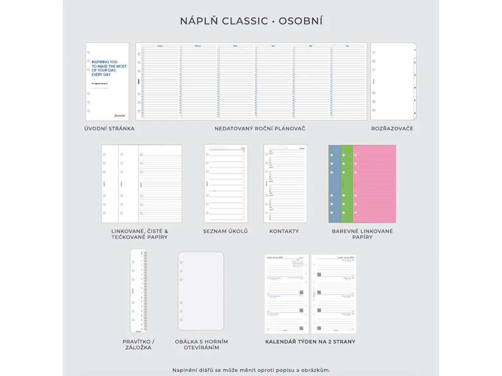 • Papírová krycí stránka, přední strana, nedatovaný roční plánovač, kalendář CZ&SK, 6 rozdělovačů, tečkované papíry, čisté papíry, linkované papíry, seznam úkolů, kontakty, modré linkované papíry, zelené linkované papíry, růžové linkované papíry, pravítko / záložka, obálka s horním otevíráním. Standardní naplnění je dodáváno zdarma a může se lišit od popisu nebo obrázku.
