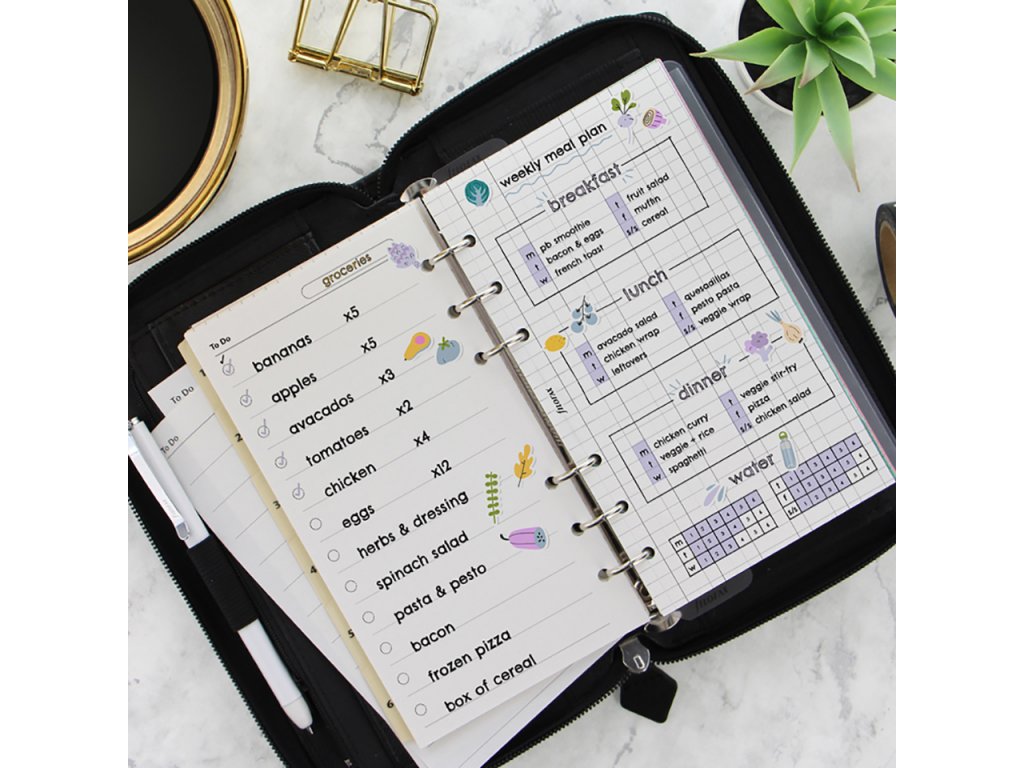 - Papírová krycí stránka, přední strana, nedatovaný roční plánovač, kalendář CZ&SK, 6 rozdělovačů, tečkované papíry, čisté papíry, linkované papíry, seznam úkolů, kontakty, modré linkované papíry, zelené linkované papíry, růžové linkované papíry, pravítko / záložka, obálka s horním otevíráním. Standardní naplnění je dodáváno zdarma a může se lišit od popisu nebo obrázku.