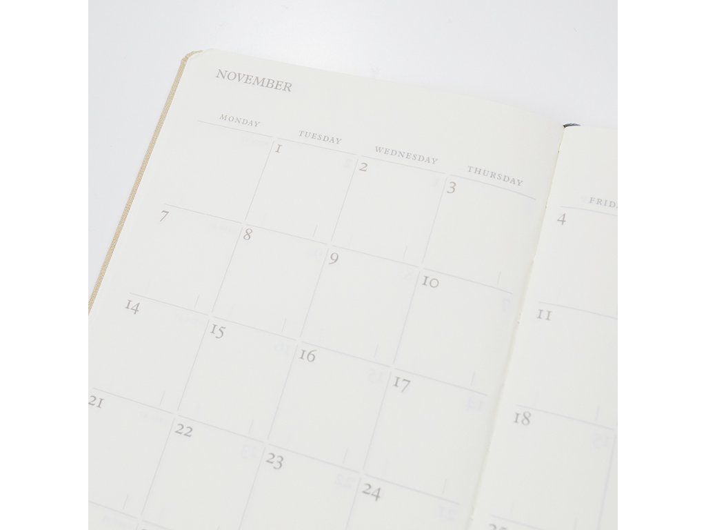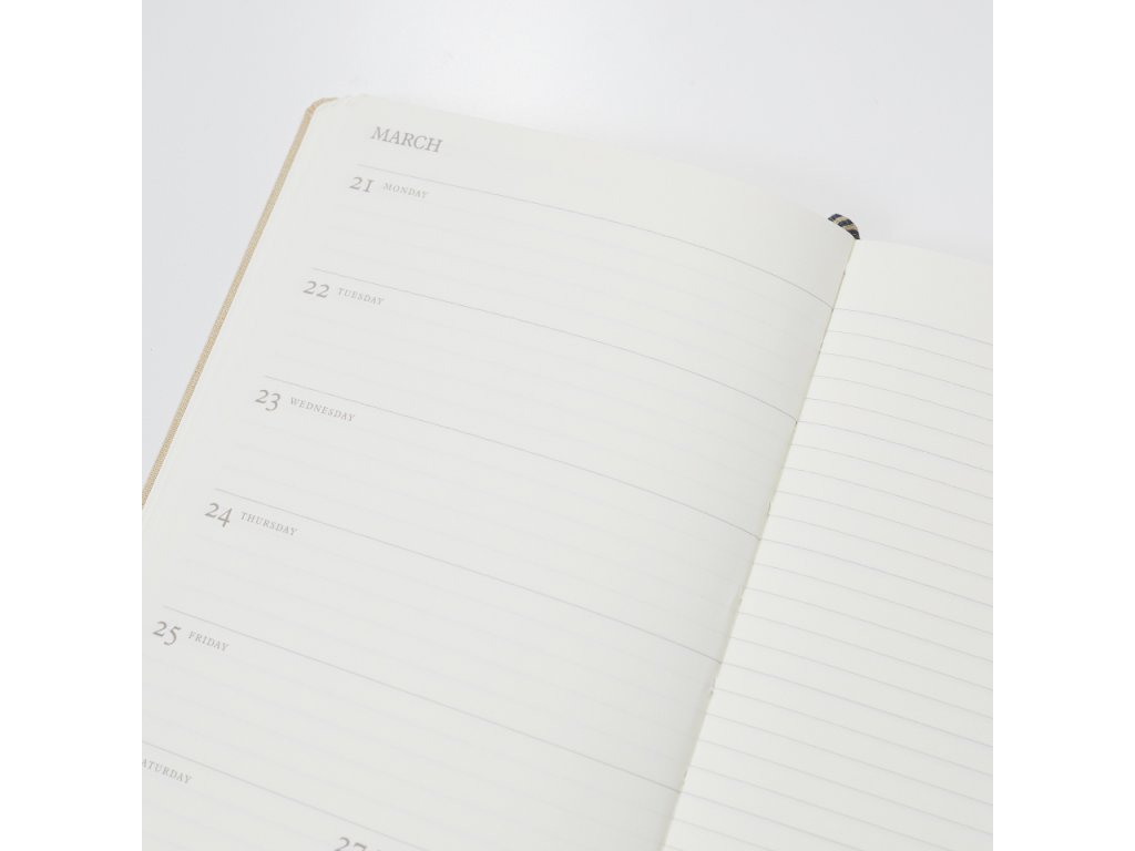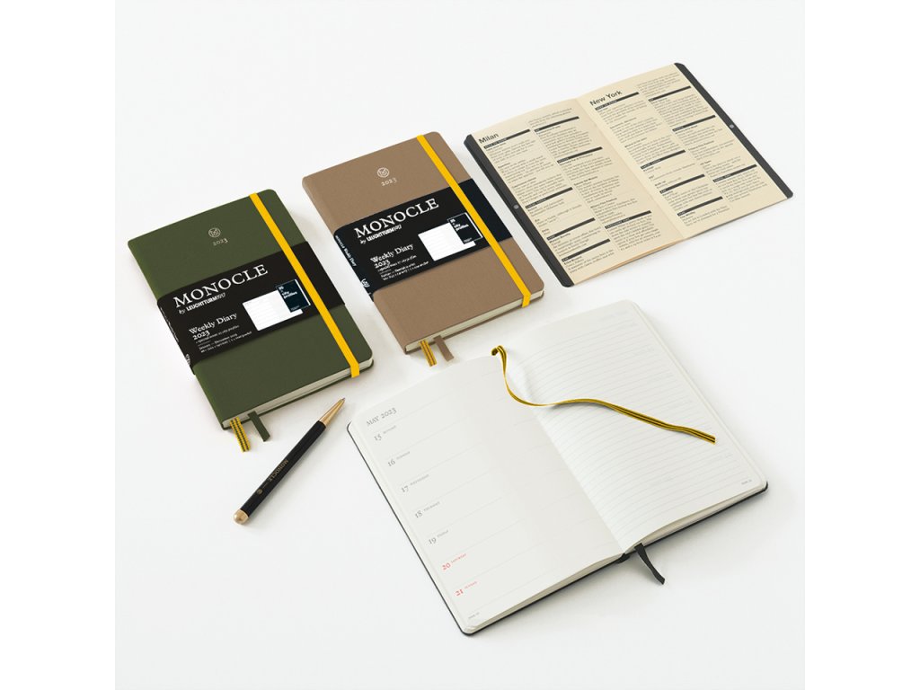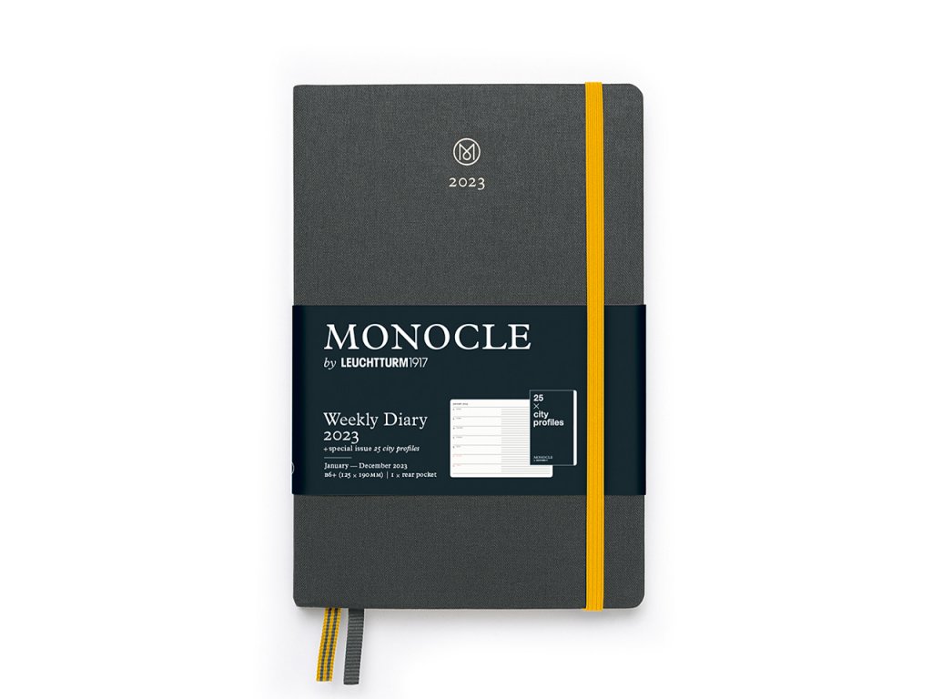 Týdenní diář Monocle by Leuchtturm1917 na rok 2023 kombinuje výhody stručného a jasného plánování s volností linkovaného zápisníku. Na levé straně je přehled týdne a na pravé linkovaná stránka. Díky tomu je ideálním společníkem pro ty, kteří hledají datovanou verzi týdenního diáře s prostorem pro poznámky, náčrty, koláže atd.