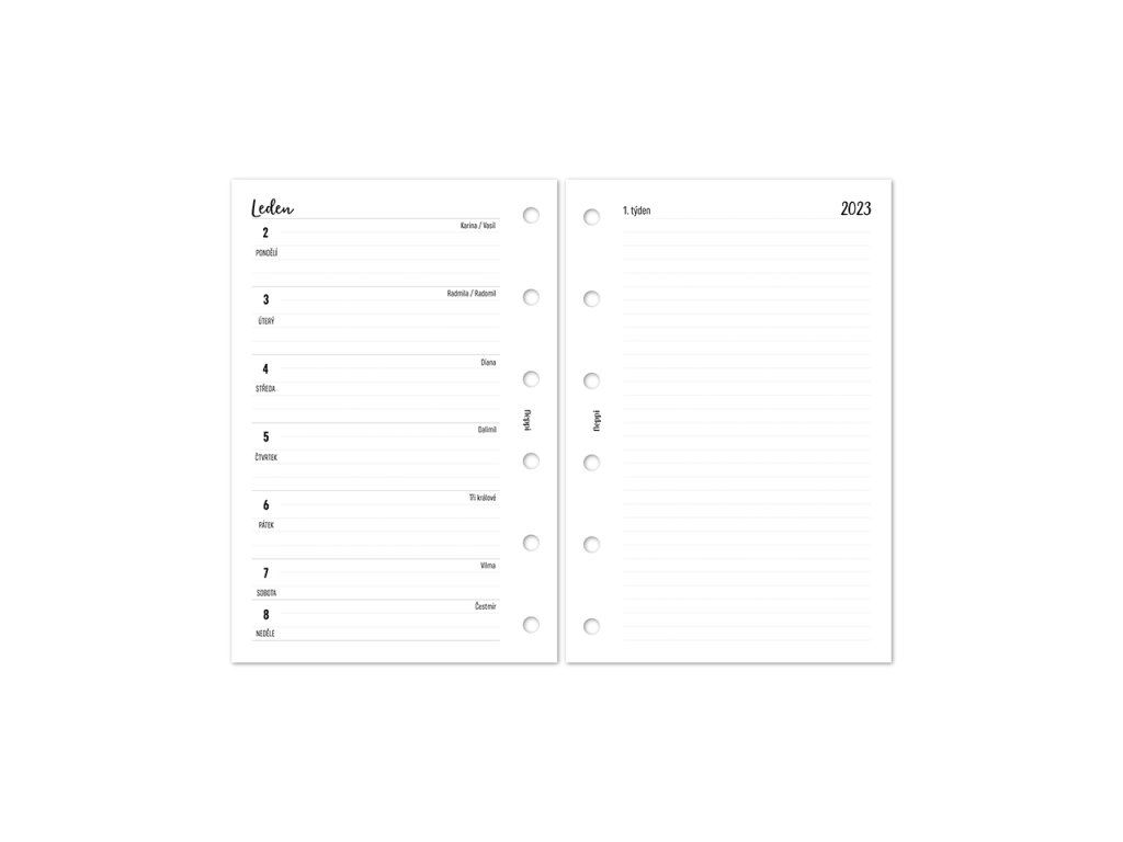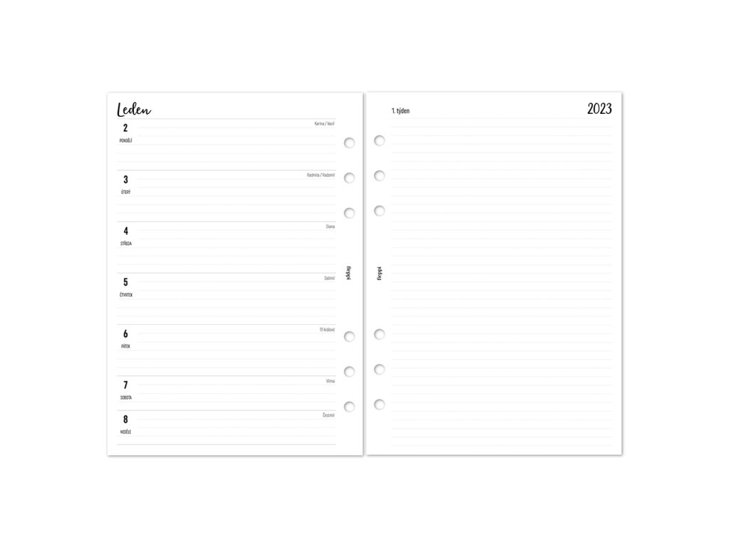 Náhradní náplň do diáře kalendář na rok 2023. Rozložení náplně je týden na levé straně a prostor pro poznámky na pravé straně. Součástí náplně jsou i další listy pro vaše plánování.
