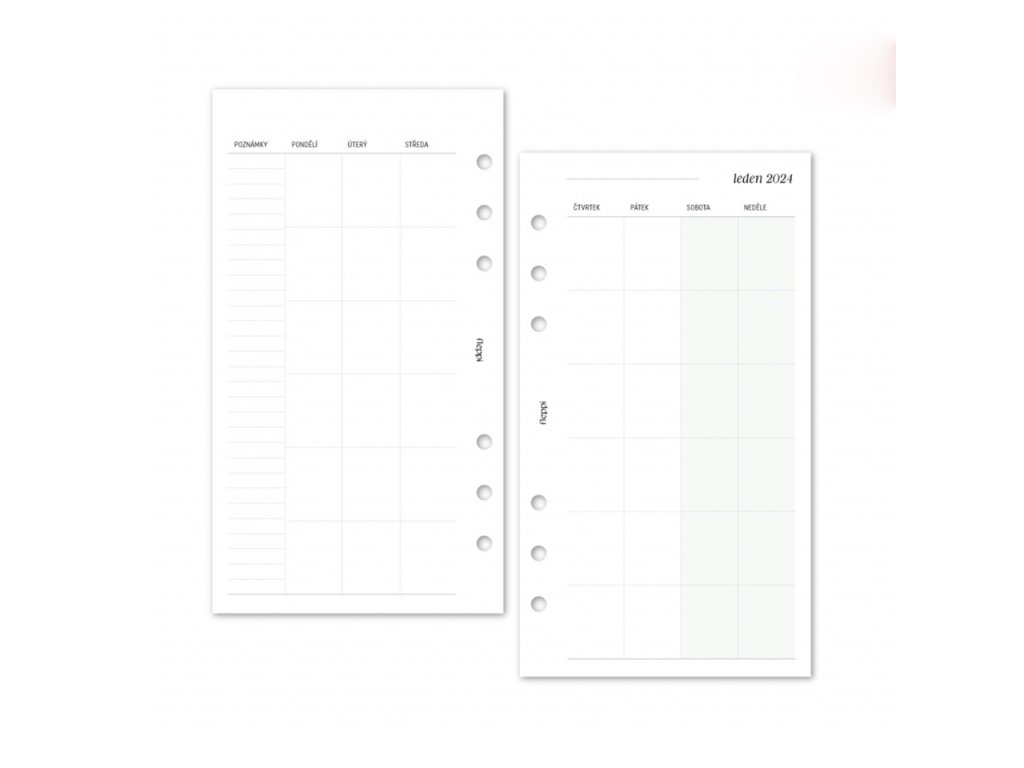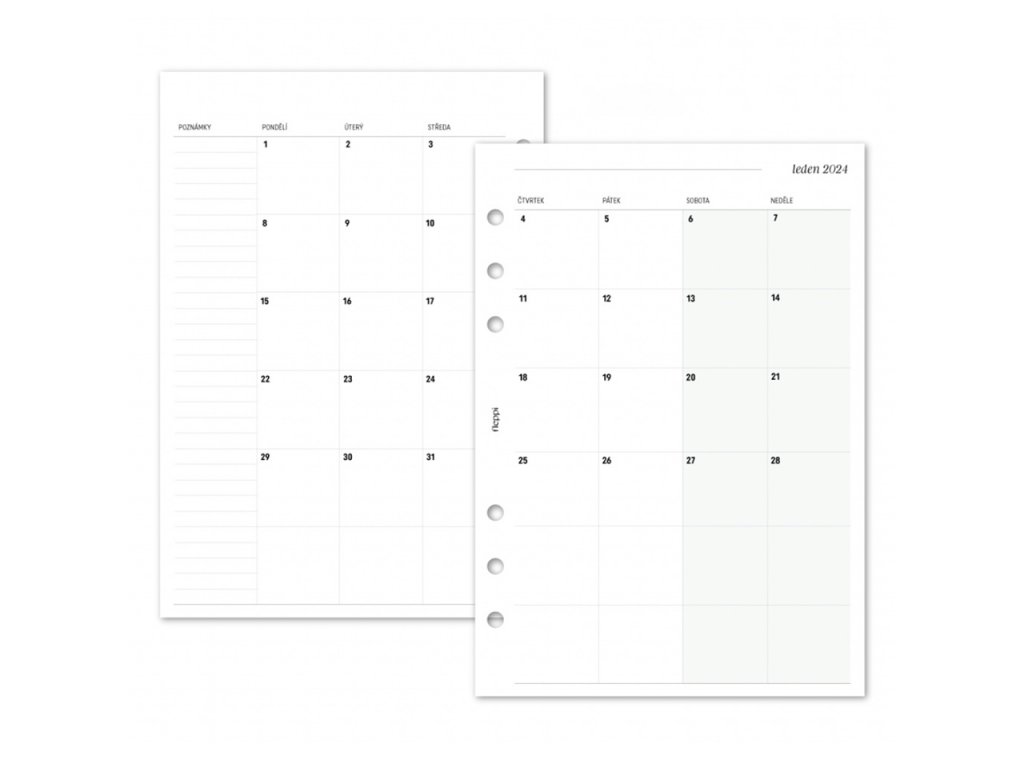 Náhradní náplň do diáře s měsíčními přehledy na rok 2024. Měsíce na dvoustraně následují hned za sebou, můžete si je tedy vložit na začátek svého kalendáře. Na úvodní stranu si navíc můžete zapsat své největší plány pro rok 2024 a na poslední straně najdete prostor pro poznámky.