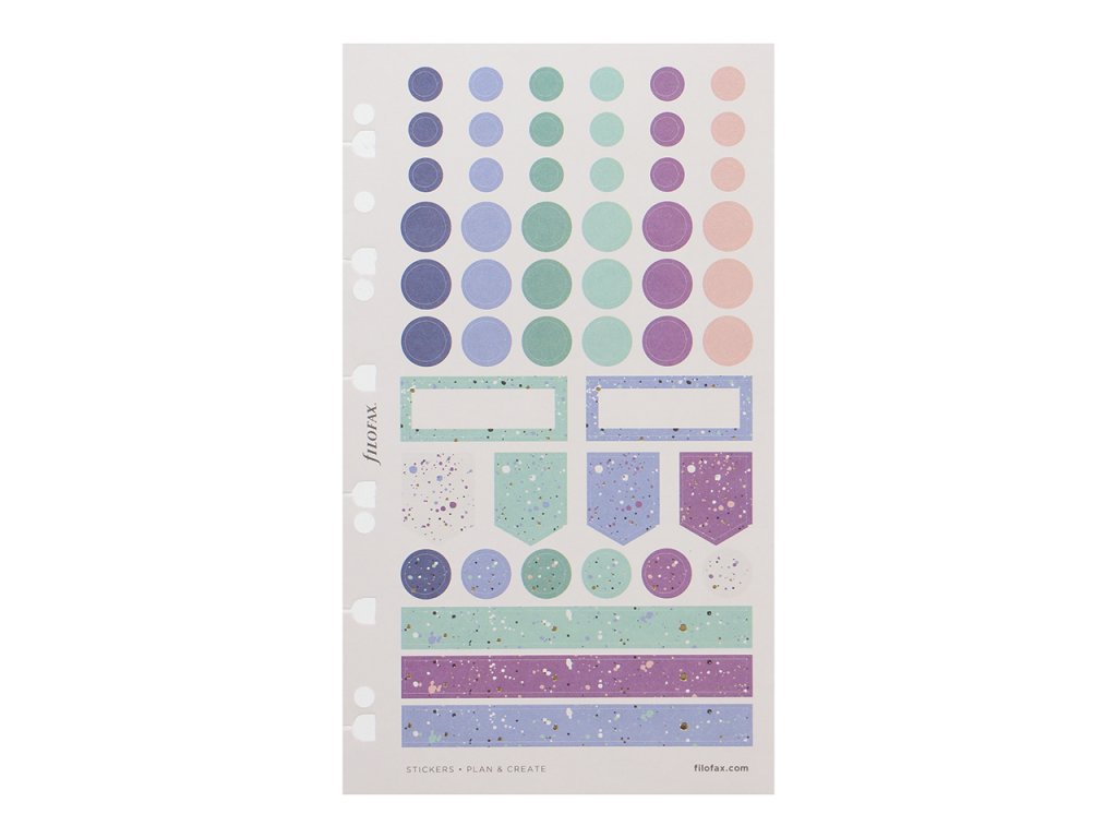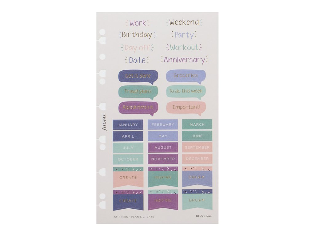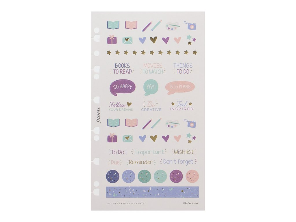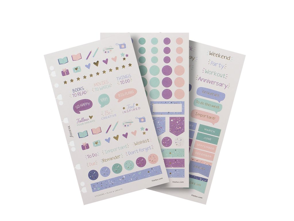 Sada 284 samolepek Filofax z kolekce Expressions. Samolepky můžete přelepovat a mají matný povrch, takže na ně můžete jednoduše psát. Tato sada byla speciálně navržena tak, aby doplnila Váš diář či Clipbook ve velikostech A5 nebo Osobní (A6) a také zápisník Filofax Notebook A5.