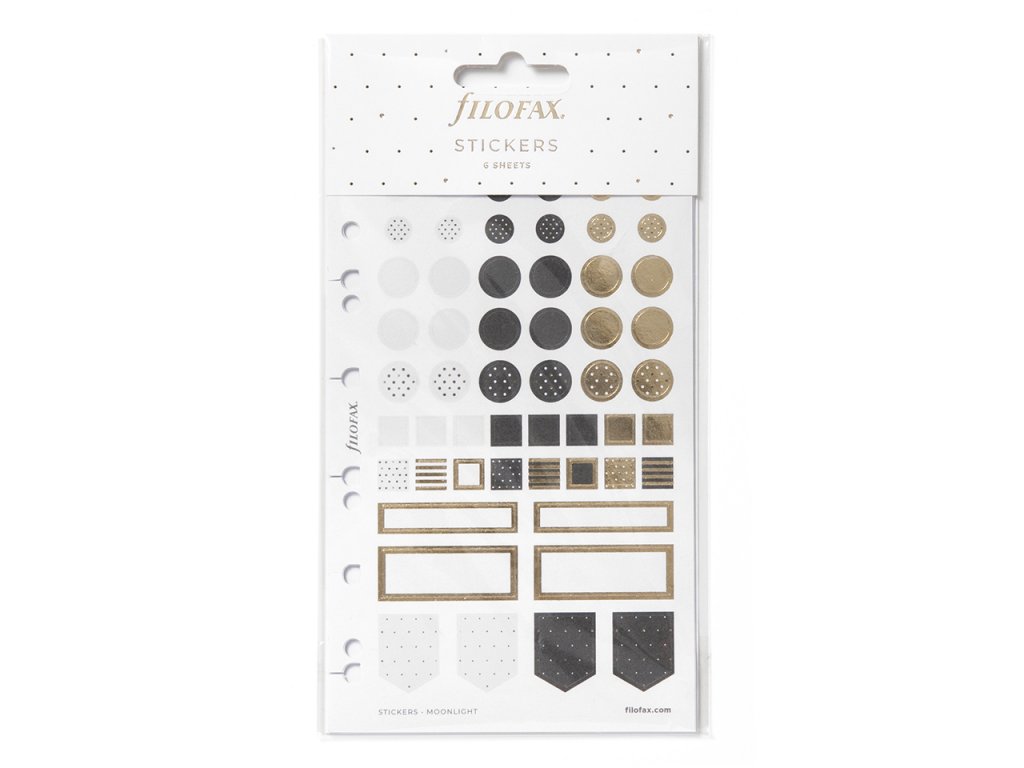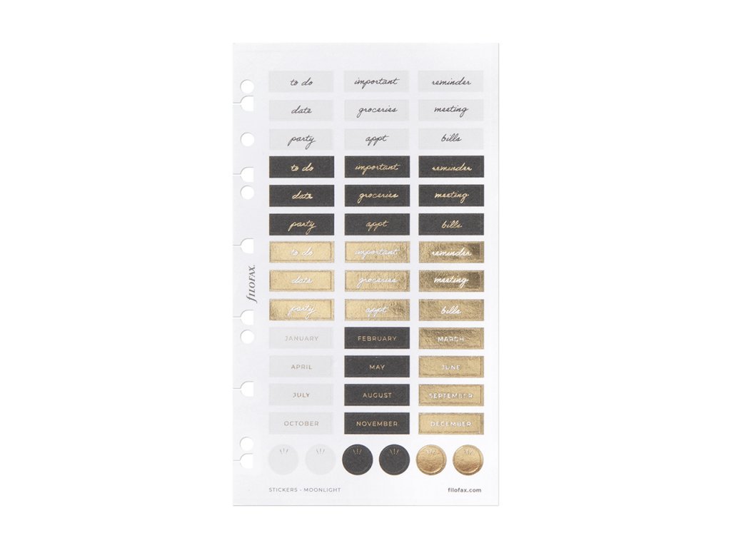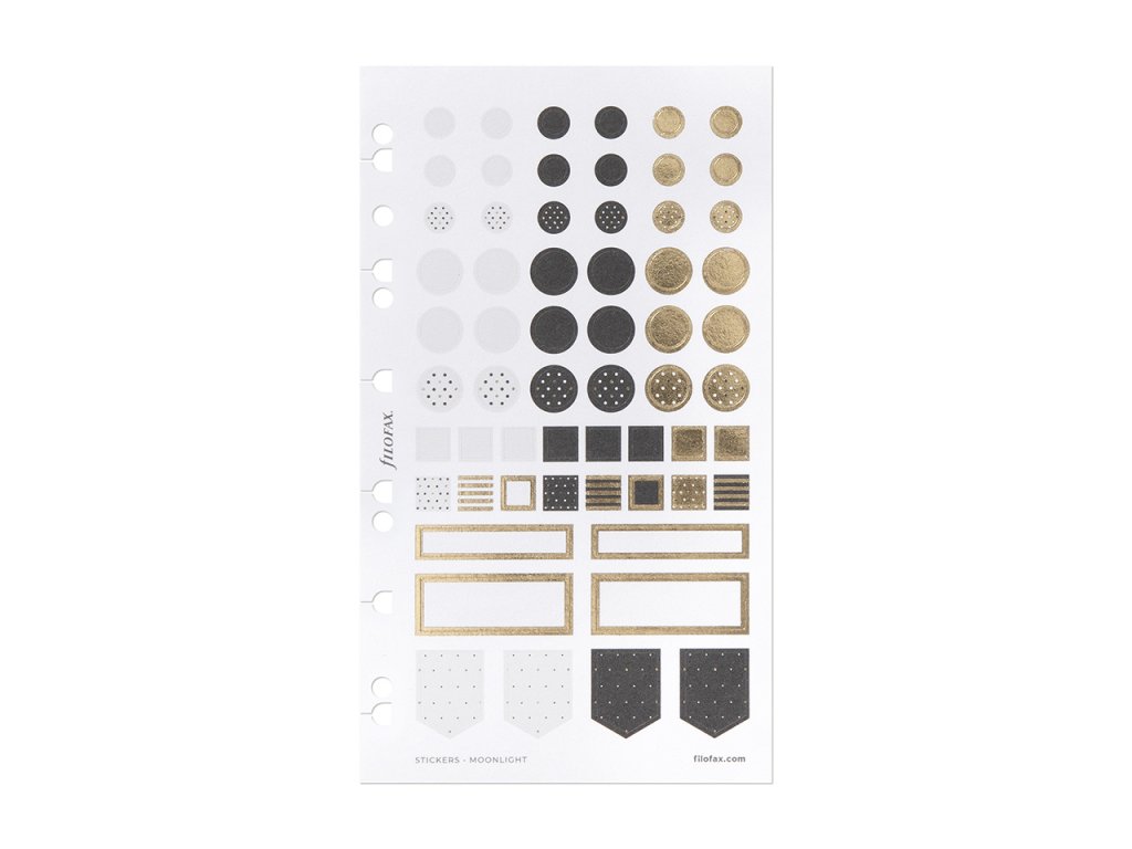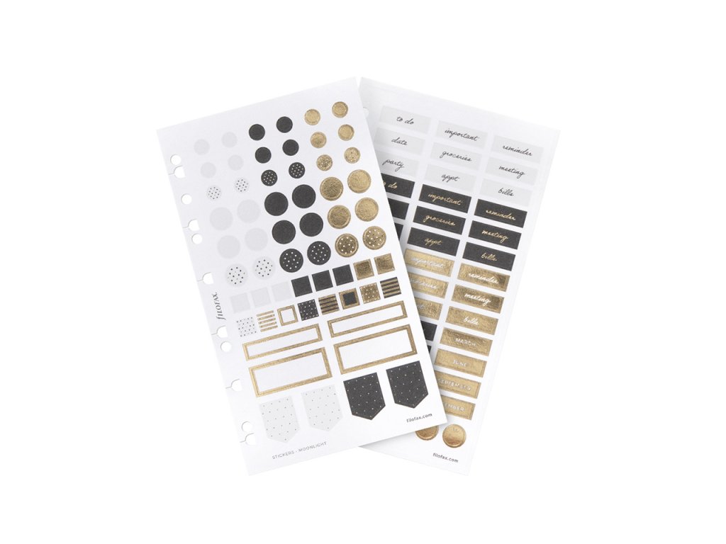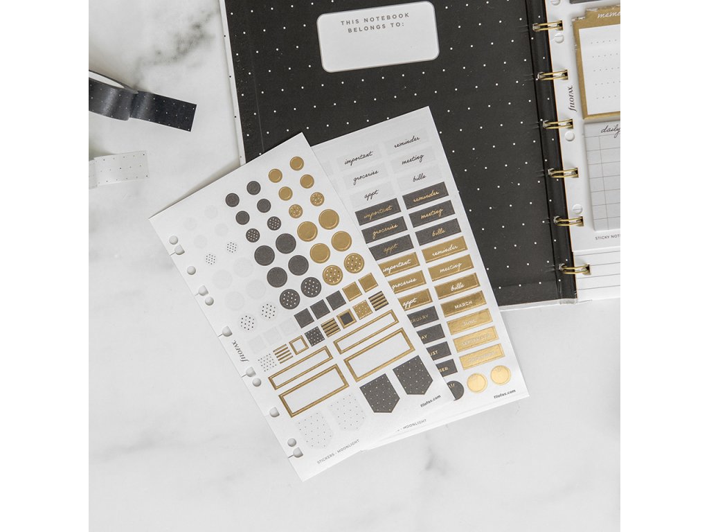 Tato nádherná sada samolepek z kolekce Moonlight dodá vašemu plánování eleganci a půvab. Samolepky jsou přemístitelné a mají matný povrch. Díky tomu na ně můžete snadno psát. Aršíky lze snadno vložit do vašeho diáře či Clipbooku velikosti A5 nebo Osobní, stejně tak do zápisníku Filofax Notebook A5 a A4.