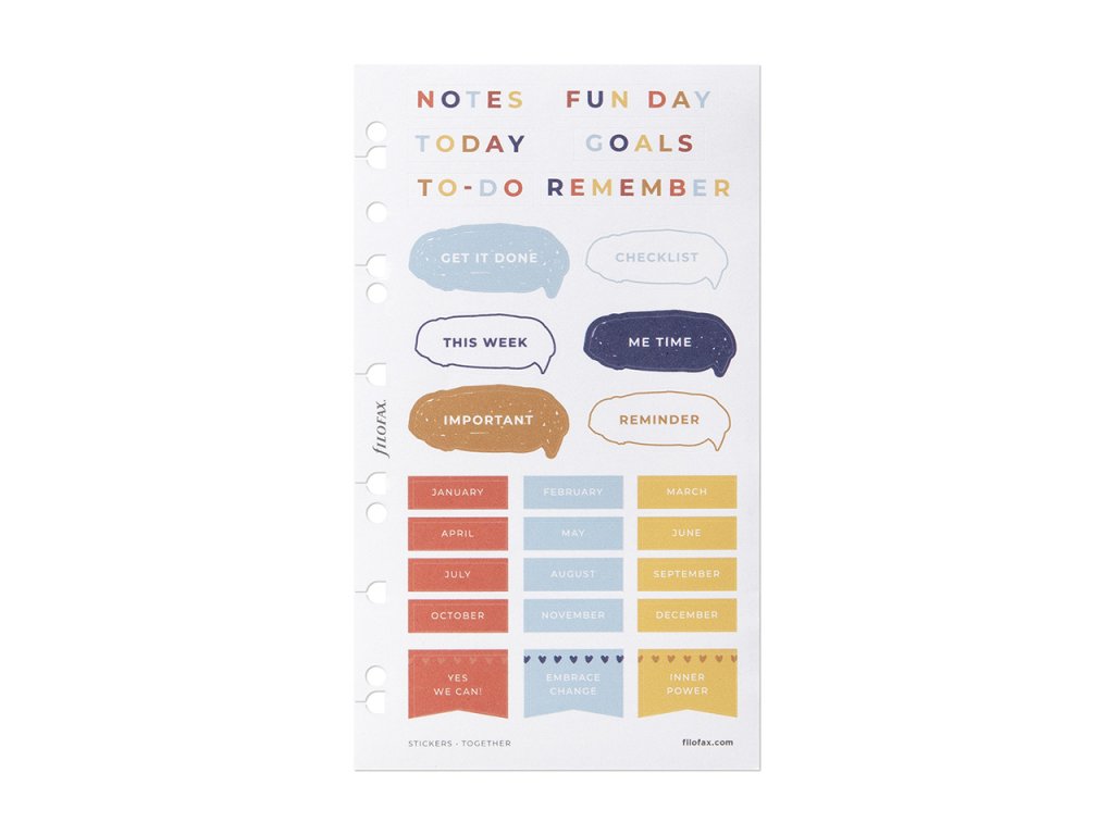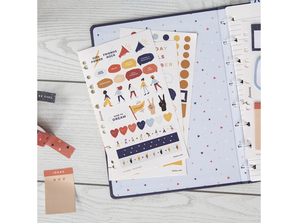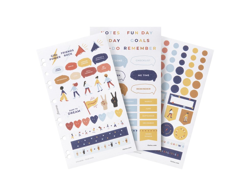 Tato okouzlující sada samolepek je plná zábavných motivů z kolekce Filofax Together. Samolepky můžete opakovaně nalepovat a jsou vytištěné na matném povrchu, takže na ně můžete snadno psát. Tuto sadu samolepek snadno umístíte do vašeho diáře Filofax a Clipbooku velikosti A5 či osobní nebo do vašeho doplňovatelného zápisníku Filofax Notebook velikosti A5. 10% ze zisku z nákupu kolekce Together bude věnováno globální neziskové organizace Girl Rising, která vzdělává a posiluje postavení dívek po celém světě.