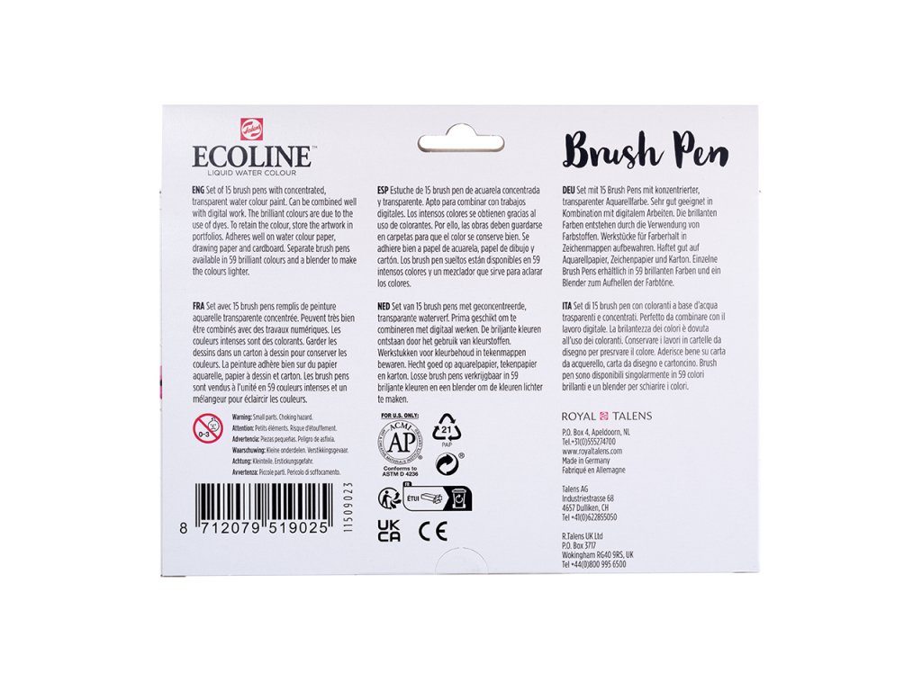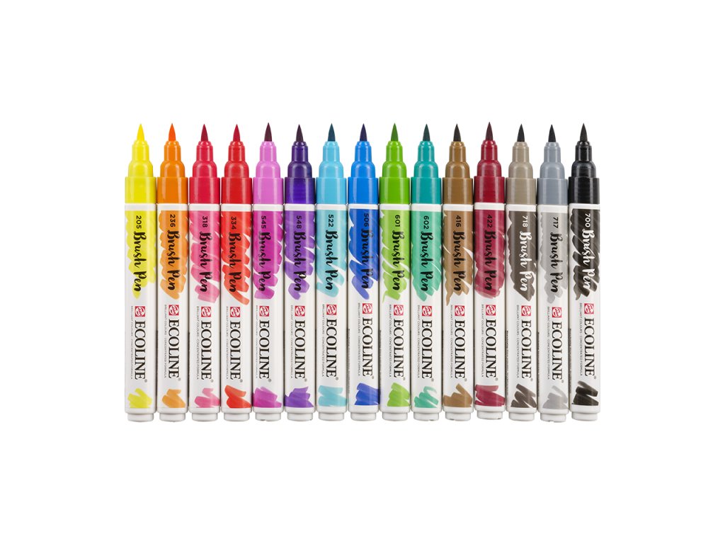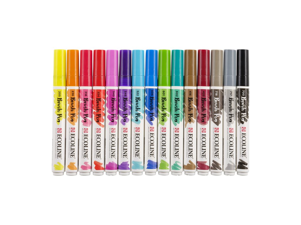 Oblíbené akvarelové fixy Ecoline Brush Pen v sadě 15ks. Barvy jsou na vodní bázi - dají se tedy rozmývat i vzájemně míchat. Jsou typické svým vysokým leskem, sytostí a jasem. Podle vyvíjeného tlaku na hrot lze měnit šířku linky od tenké až po cca 6mm širokou. Perfektně se hodí na kaligrafii, ilustrace, bullet journaling a kreativní tvoření.
