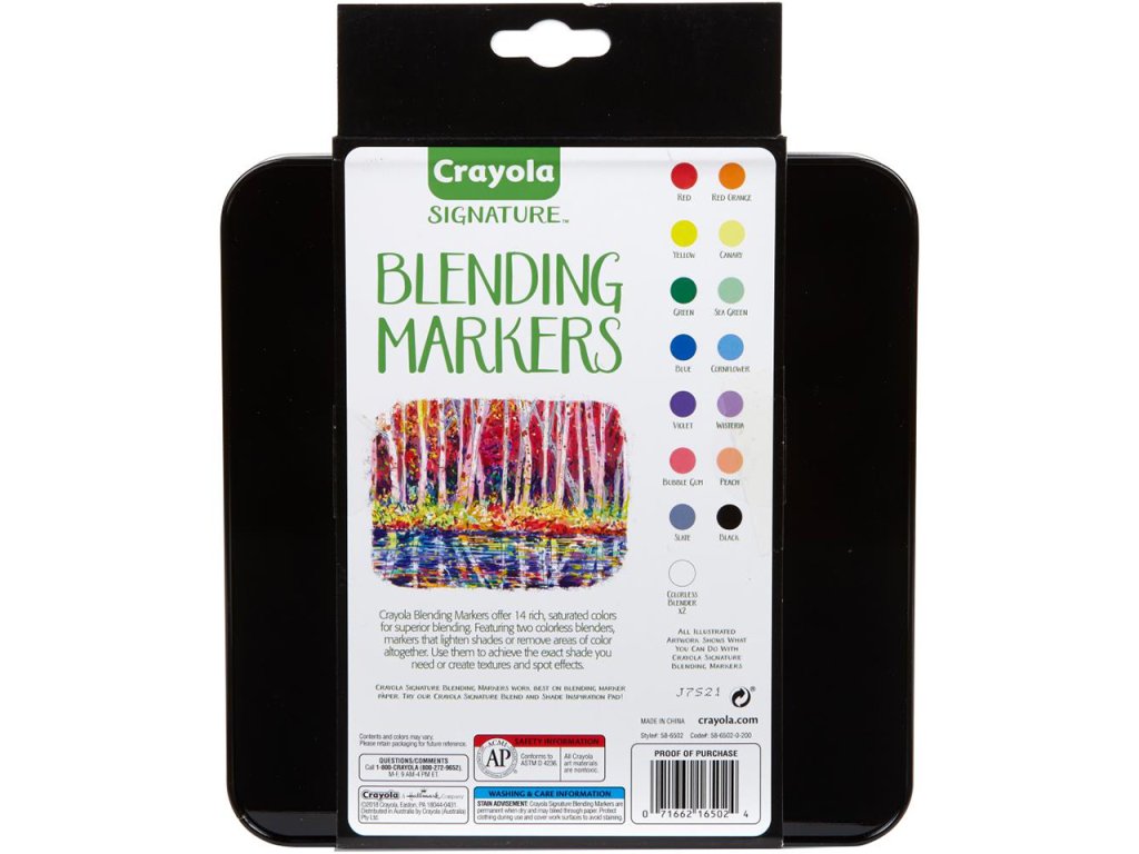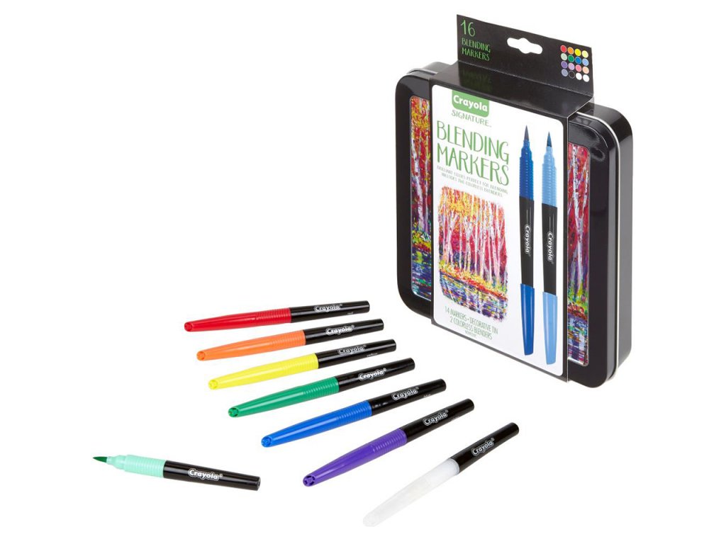 Sada štětcových fixů Crayola Signature Blending Markers v dekorativní plechové krabičce. Perfektně se hodí na kaligrafii, ilustrace, bullet journaling a kreativní tvoření.