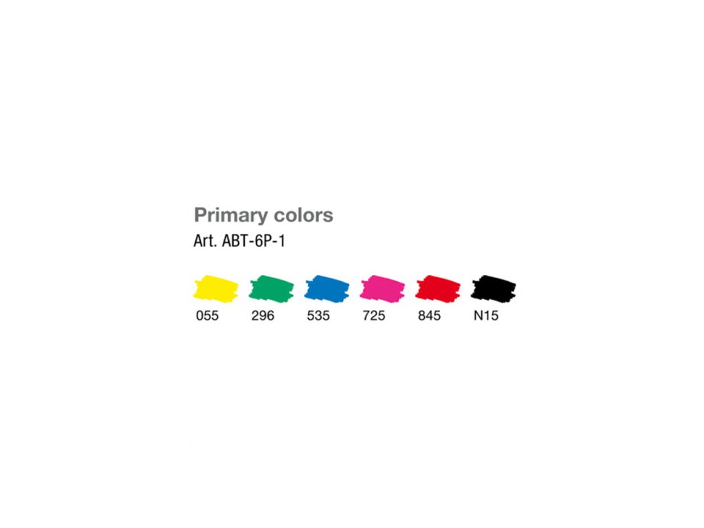 Sada obsahuje 6 základních barev: ABT-N15 (černá), ABT-296 (zelená), ABT-055 (žlutá), ABT-535 (modrá), ABT-725 (růžová), ABT-845 (červená).