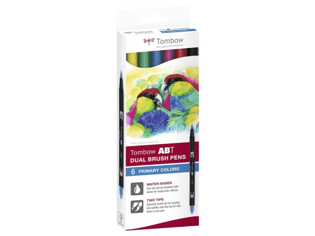 Sada 6 oboustranných fixů Tombow Dual Brush Pen. Na jedné straně je tenký hrot pro drobné linky a na druhé štětcový hrot vhodný i na silnější tahy. Fixy jsou na vodní bázi, bez zápachu. Barvy nejsou stálobarevné.