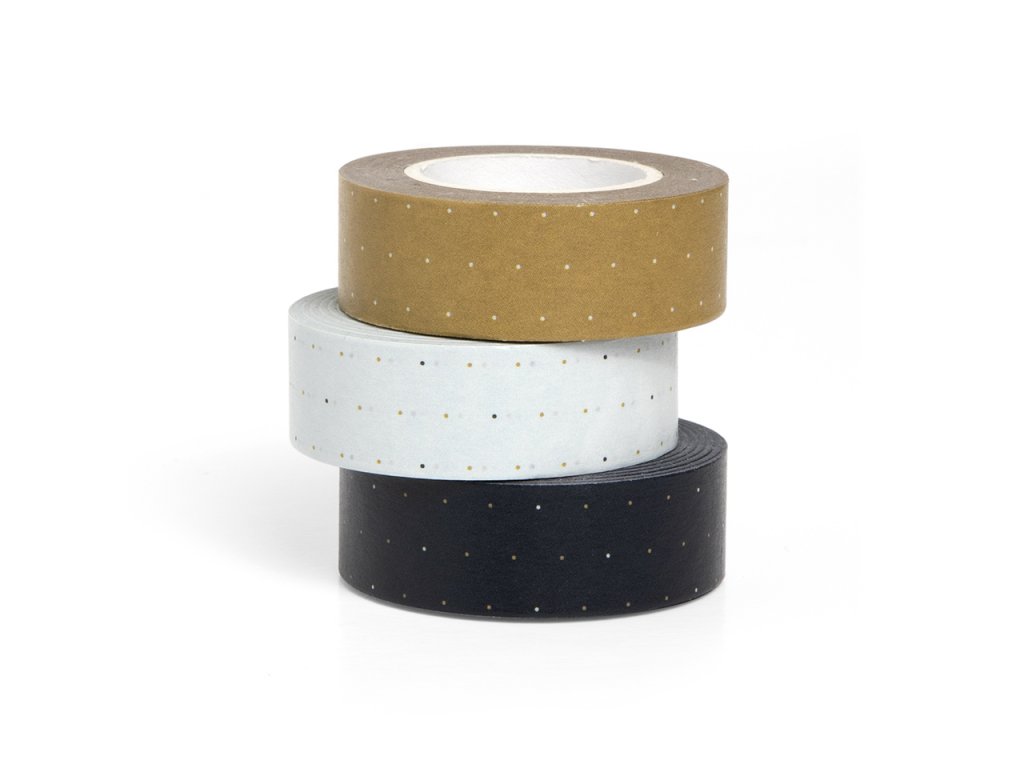 Zdobte a bavte se s touto sadou tří washi pásek ve zlaté, černé a bílé barvě z kolekce Moonlight.